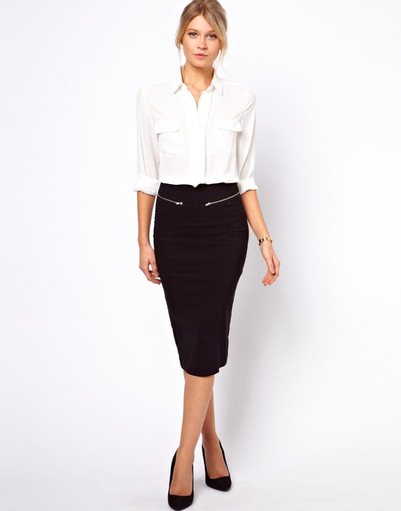 – Si escoges la falda tipo lápiz se sugiere que sea a media rodilla o incluso bajo esta.