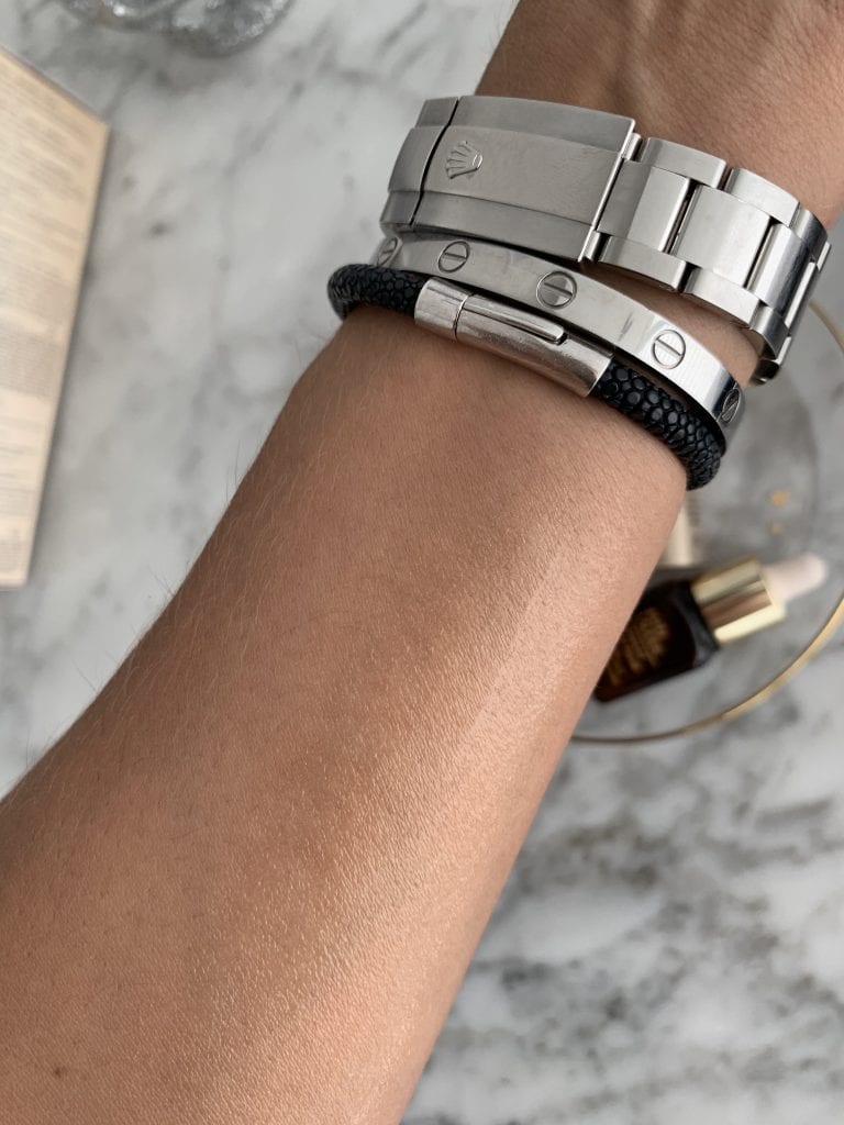Como pueden ver en esta foto donde la probé en mi antebrazo este es el reflejo que da: Muy natural y sutil.