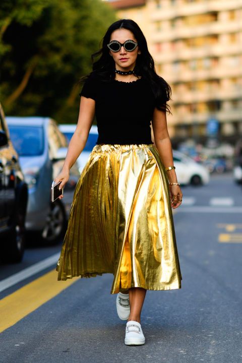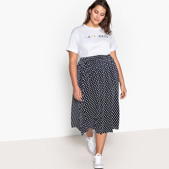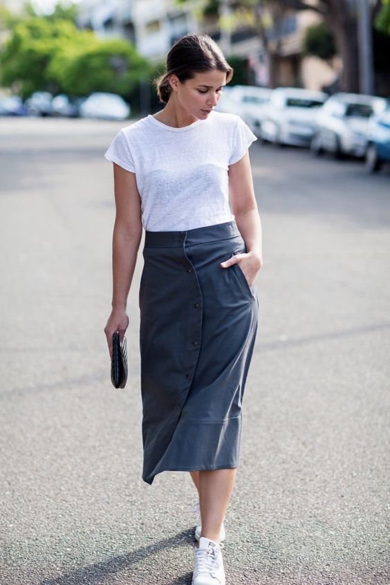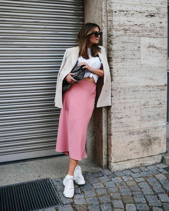 La falda midi es una de las prendas que mejor queda combinada con zapatillas blancas. ¿La razón? El largo a media pierna, al dejar el tobillo descubierto, es perfecto para lucir al máximo tus zapatillas, además de ser un detalle que estiliza al instante.