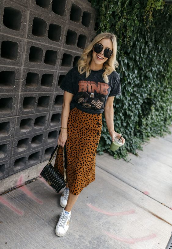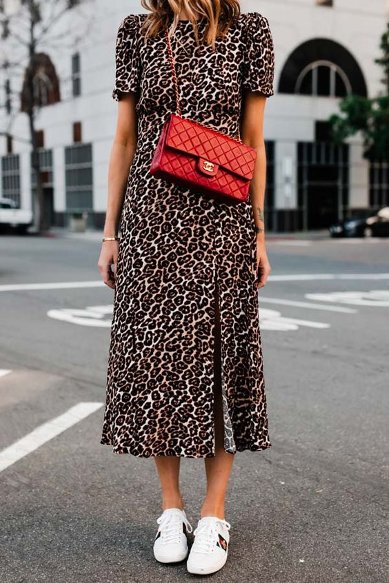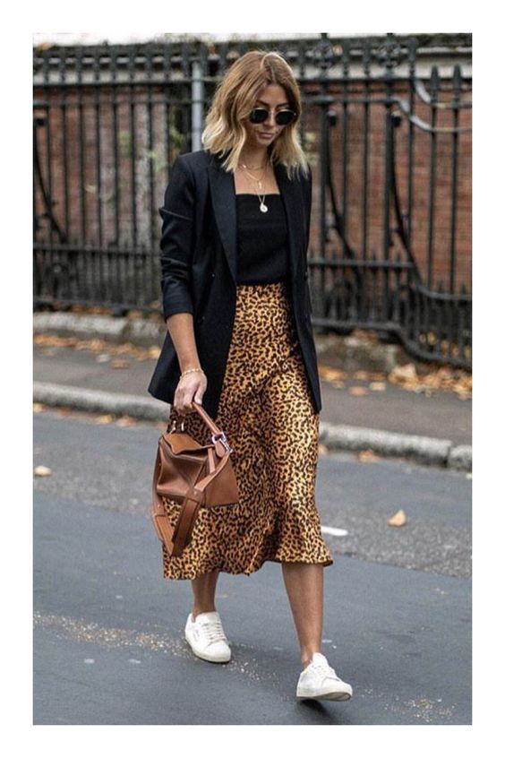 La intensidad y personalidad de las prendas animal print (como faldas, vestidos y poleras), encuentran su punto de equilibrio ideal combinadas con zapatillas blancas. Se trata de un combo perfecto, ya que ambas tendencias no compiten en protagonismo, sino que se complementan en armonía.